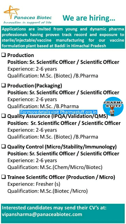 Interested candidates may send their CV's at: vipansharma@panaceabiotec.com